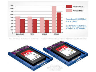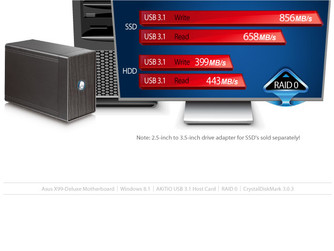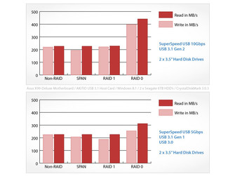 (Teszt környezet: Asus X99-Deluxe alaplap, Windows 8.1, AKiTiO USB 3.1 kártya, RAID 0, CrystalDiskMark 3.0.3)