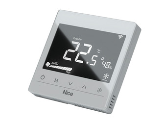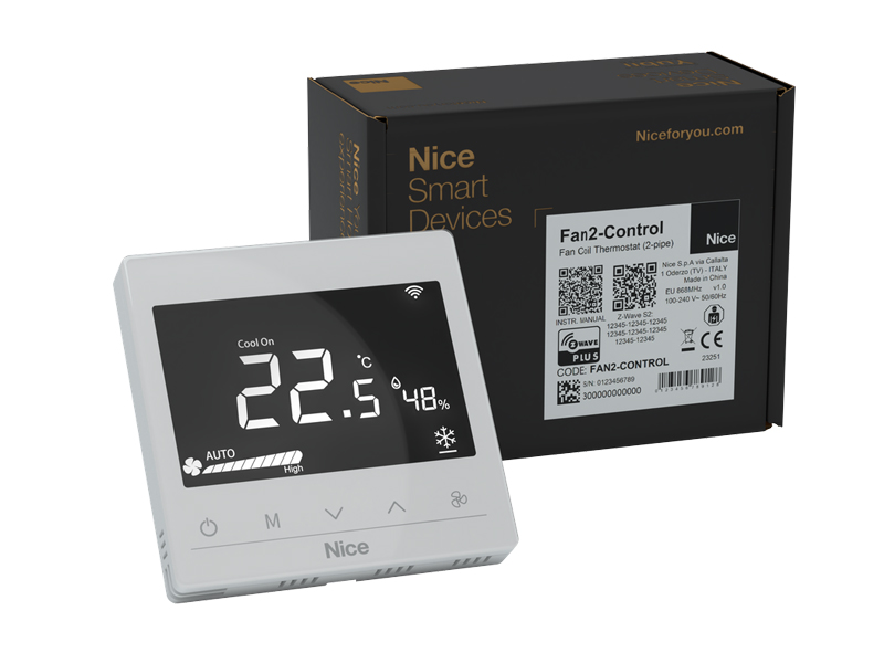 A Nice Fan4-Control egy Z-Wave 800-as sorozatú, falra szerelhető termosztát, amelyet kifejezetten 4-csöves fan-coil rendszerek vezérlésére terveztek. A készülék automatikusan szabályozza a ventilátor sebességét a mért és beállított hőmérséklet közötti különbség alapján, így biztosítva az optimális komfortérzetet fűtési és hűtési üzemmódban egyaránt. A termosztát flush-mount kivitelben szabványos 60 vagy 86 mm-es szerelődobozba illeszthető, így esztétikusan integrálható bármely beltéri környezetbe.