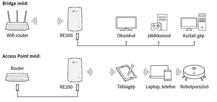 Ha szeretnéd kiterjeszteni a Wifi-routered által biztosított vezeték nélküli lefedettséget, mert a lakás távolabbi pontjain vagy épp a kertben már nem megfelelő a sebesség, akkor a TP-Link R200 hatótávnövelője talán a legegyszerűbb megoldás erre. Csatlakoztasd egy fali dugaljba ott, ahol a routertől távolabb ugyan, de még megfelelő a Wifi-kapcsolat, a készülék pedig egy új Wifi-hálózatot hoz létre. TP-Link OneMesh™ routerekkel mesh-hálózat kialakítására is képes, azaz nem újabb hálózatot hoz létre, hanem az eredeti, az eredeti néven lesz kiterjesztve. De használhatjuk Access Point-ként is.